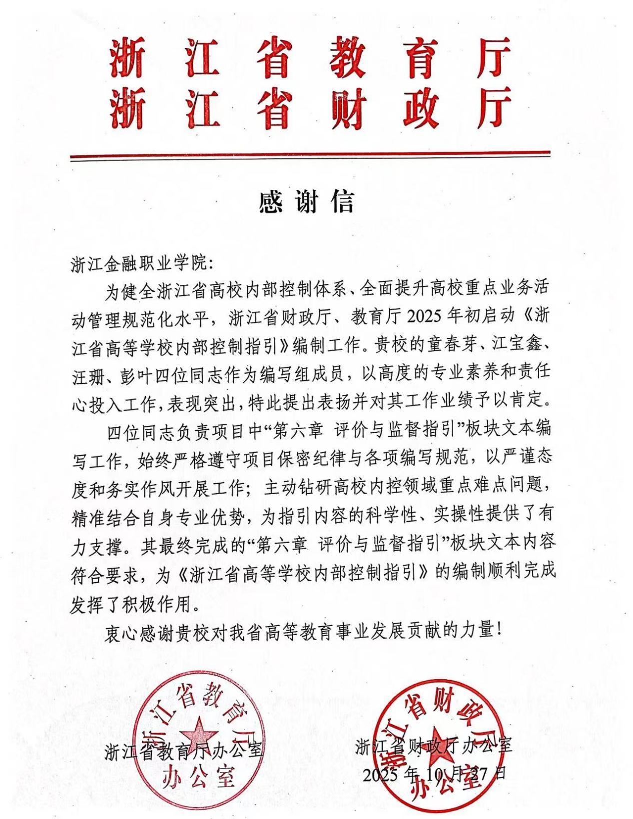 --来源:投资保险学院 作者:朱林 日期:2025-11-14近日,由浙江省财政厅、教育厅联合组织编写的《浙江省高等学校内部控制指引》(以下简称《指引》)正式发布。在该项省级重要文件的编制过程中,我院教师童春芽带领团队教师作为编写组成员,积极参与、表现突出,获得了浙江省教育厅与财政厅的联合感谢信表彰。